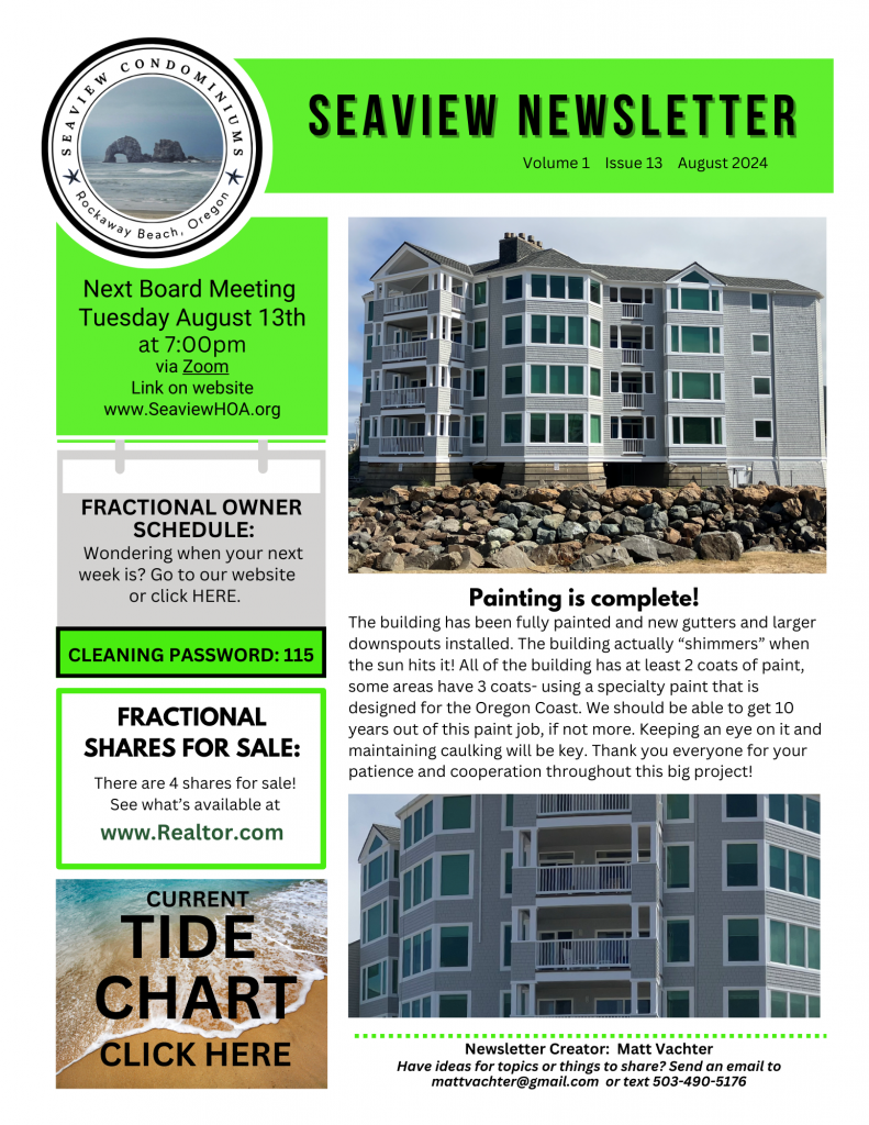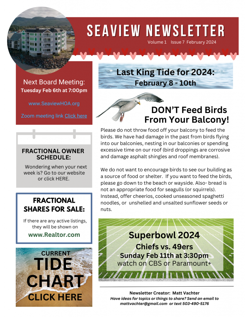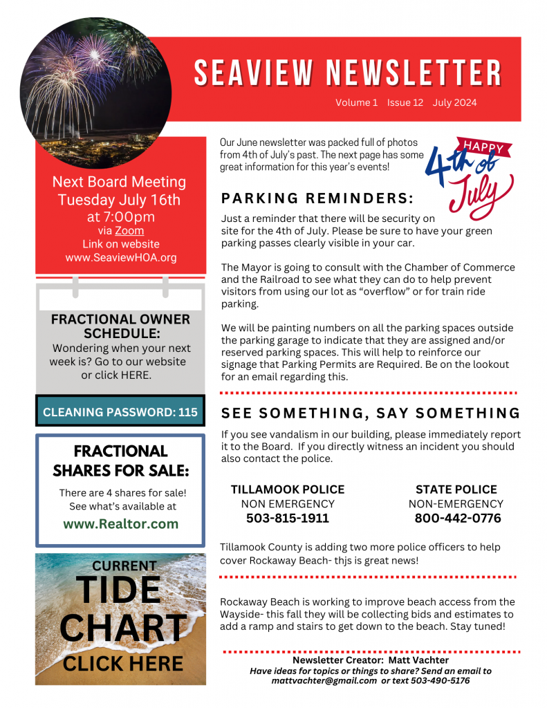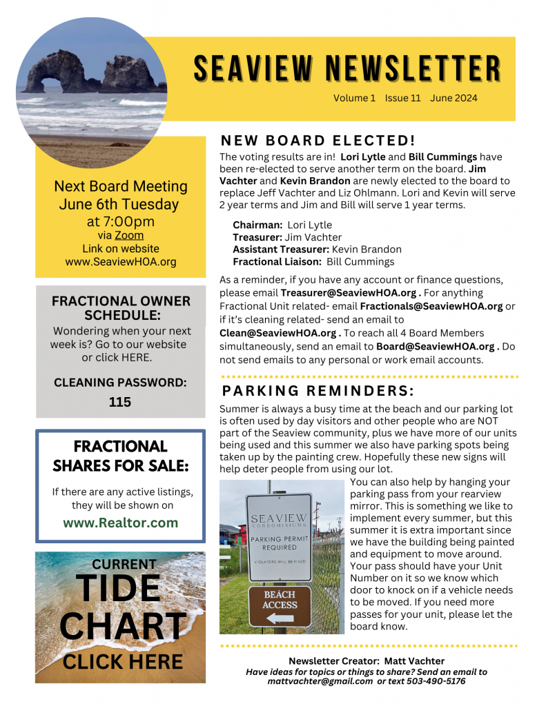 CONTACT BOARD & STAFF: The best way to contact the board is to send an email to Board@SeaviewHOA.org. This email address will reach all 4 Board Members and they can forward it appropriately to the bookkeeper or security committee if needed. Other contact information can be found on our CONTACT US page.
